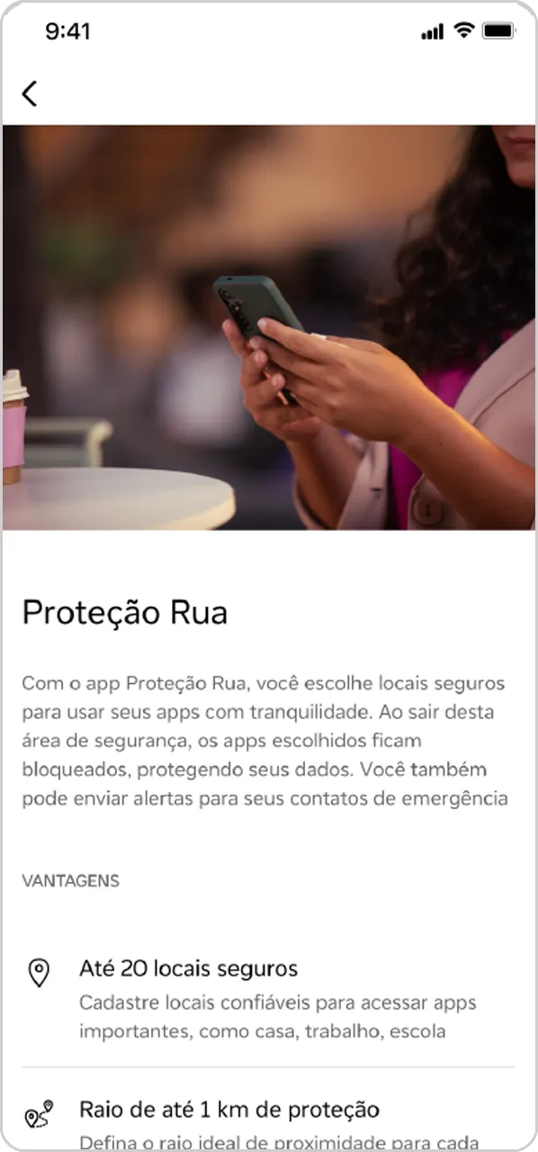O Proteção Rua permite que diante de algum roubo, assalto ou coação, você tenha acesso rápido e fácil ao desbloqueio das funções do serviço fora do seu local de confiança, por meio de uma Senha de Ameaça.